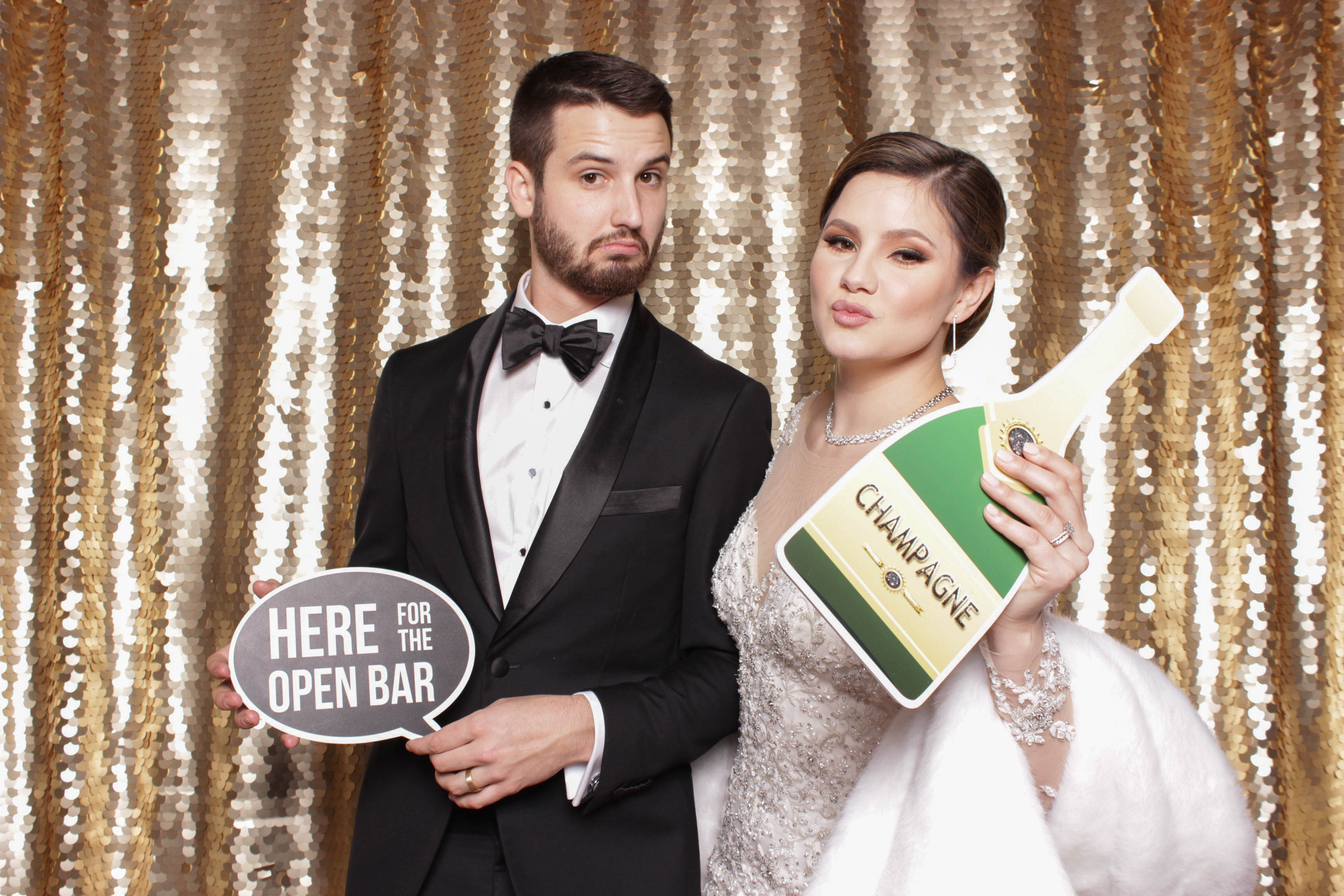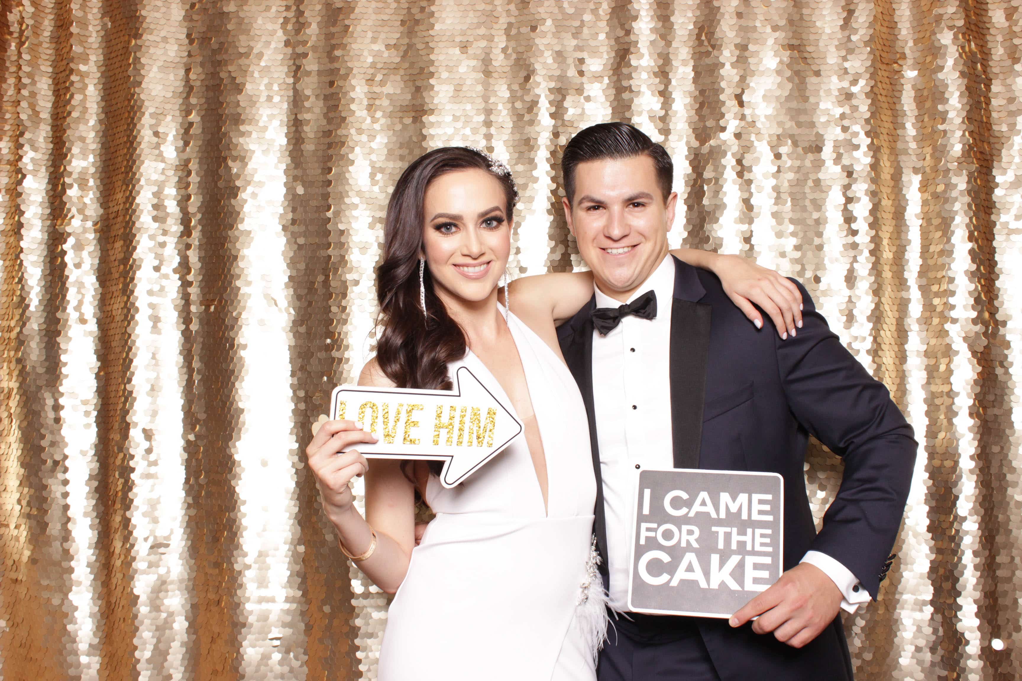 We’ve got over 20 backdrops to choose from! To name a few: Gold/White Mermaid, Black/Gold Mermaid, Silver/White Mermaid, Gold, Silver, White, Black, Raspberry. Navy, Opal, Rose, Champagne, Mint Green Chevron, Red & White Stripes, Solid Mint, Solid Pink, Gray & White, Champagne Lace, Flower Power and a few more….If you do not see something you want to use, you are more than welcome to bring your own backdrop. We can customize your photo prints with the name of the new couple, birthday girl or add a logo. Don’t have a logo? We can hook you up!
